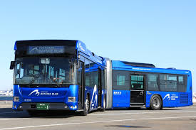 海沿いを走る青い連節バス。